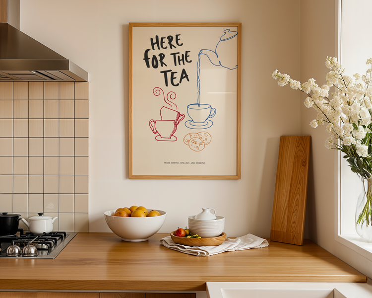 Et lekent kunsttrykk med teksten «Here for the tea».Â