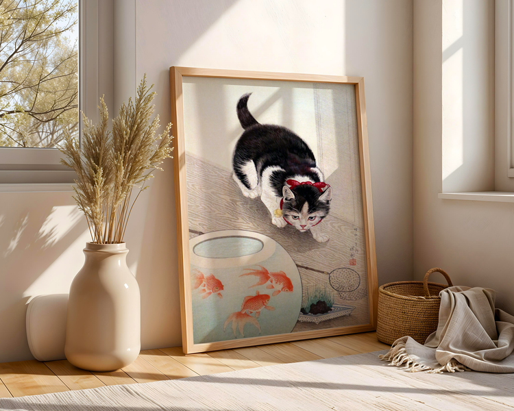 Dette kunstverket er et japansk tresnitt med tittelen «Cat and Bowl of Goldfish» (eller «Goldfish Bowl and a Cat»), skapt av kunstneren Ohara Koson i 1933.